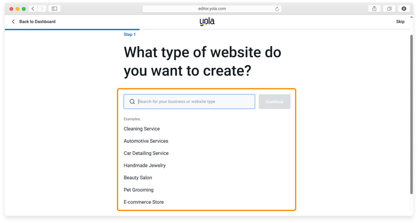 At the first step, you can specify a category or niche for your site. This helps tailor the suggestions to fit your business better. Choose one of the examples or start typing the kind of website you want to create.