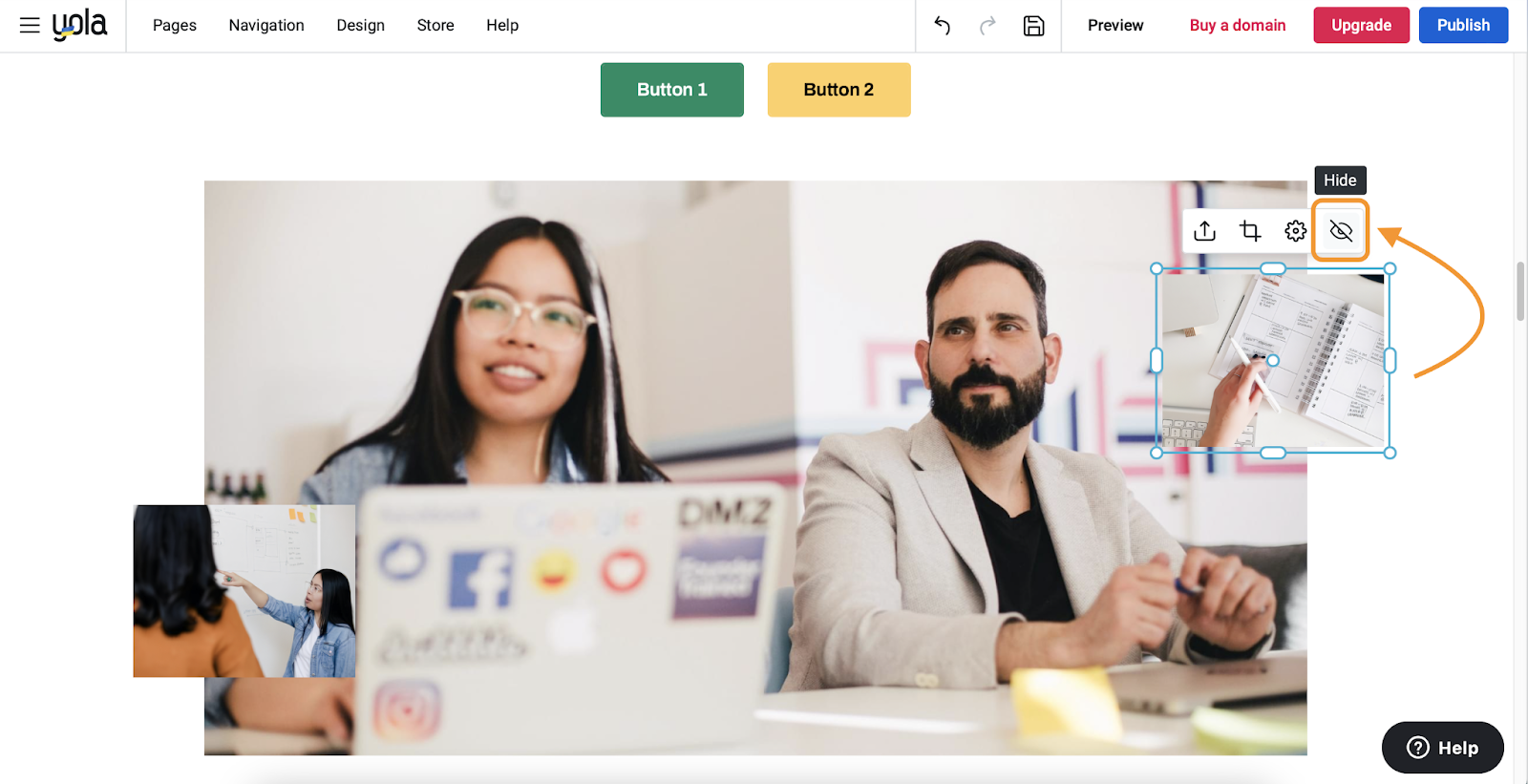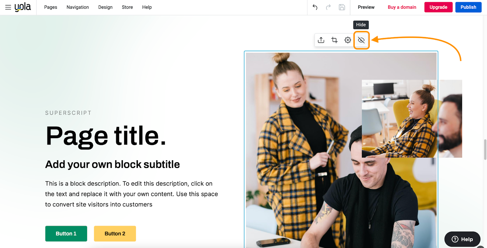 When using certain Headline, Products, and About Us block layouts, you might want to hide the overlaying media they contain. To do this, click the overlaying image and then click the Hide button on its control pane.