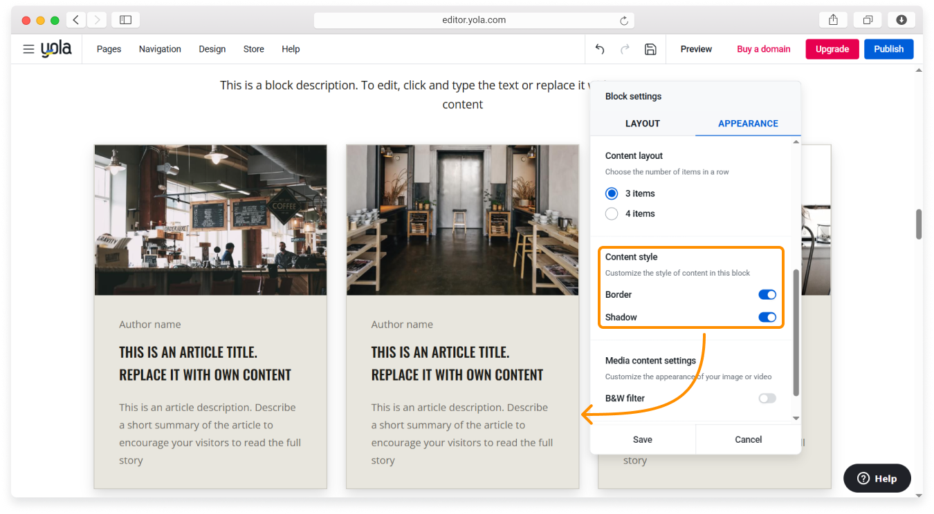 Add a border and a shadow to make the elements stand out on the page by enabling the respective toggles.