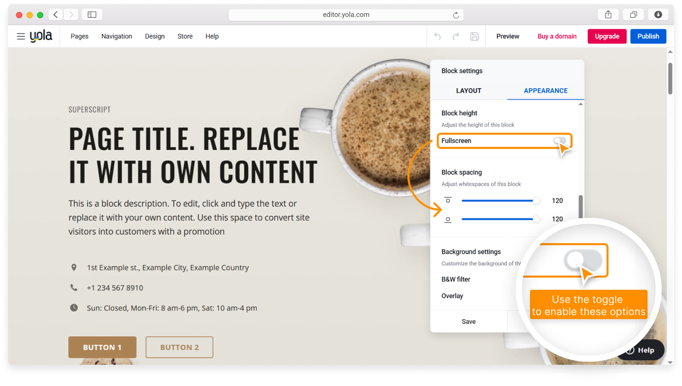 Note: Some blocks do not have the spacing option. For example, you can’t adjust it in the full-width Gallery blocks. Also, in some full-width blocks, such as the Header block and the Contact us block, the spacing option can be enabled by switching off the Fullscreen toggle.