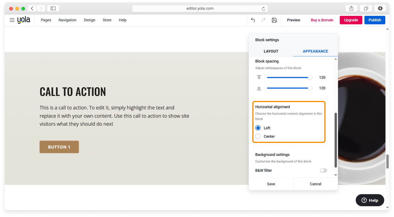 You can customize the horizontal and vertical content alignment of various blocks, for example, the Call to action block and the Text block. Click the respective radio button to align your block content to the left or to the center.
