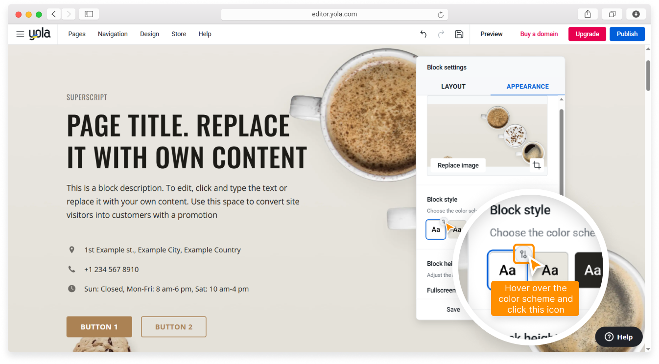 If you want to customize the colors of your block, hover over one of the color scheme options in the Block style section and click the Customize icon.