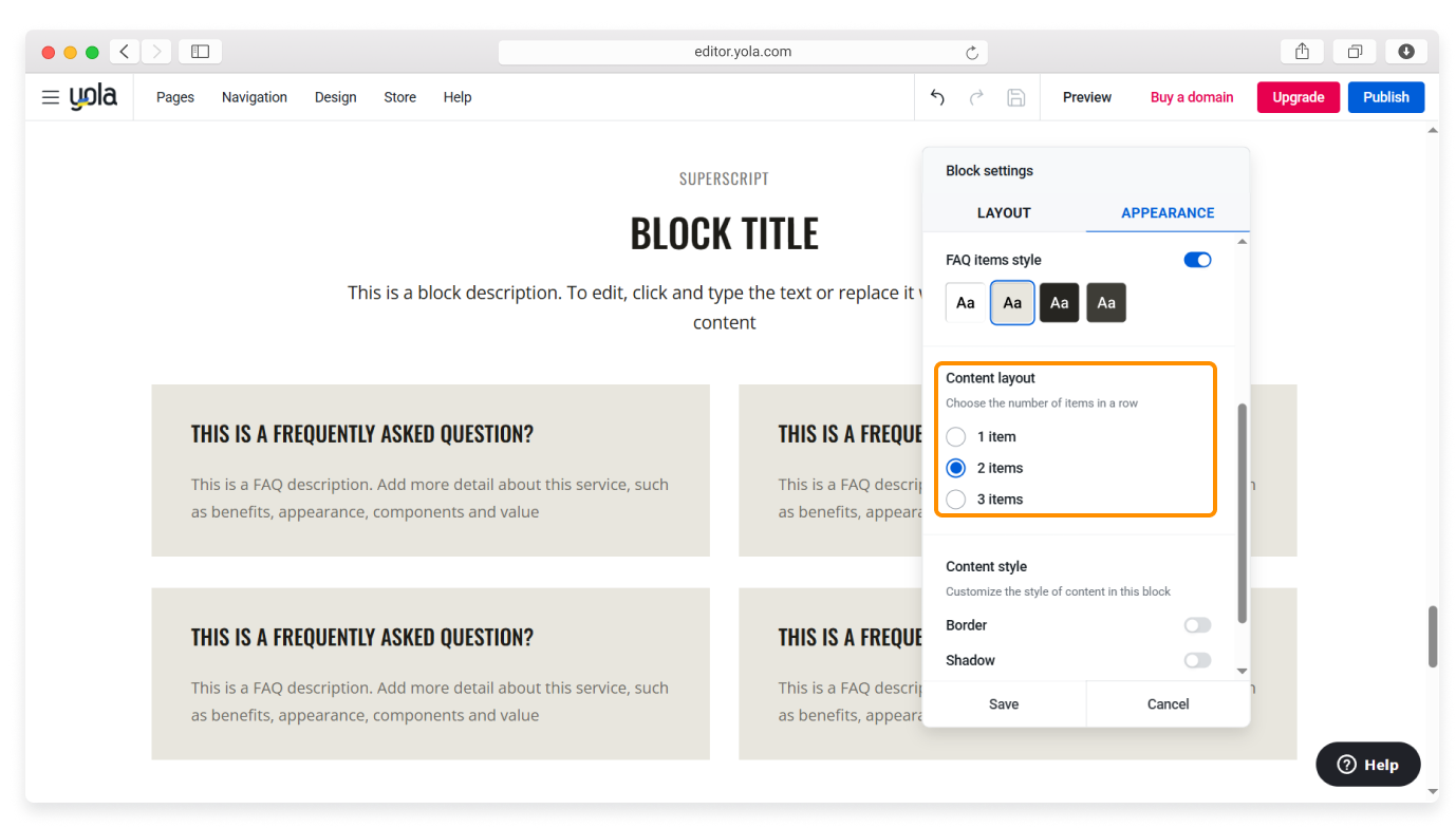 Some blocks allow you to choose the number of items in a row (for example, the Gallery block and the FAQ block). Select one option from a set by clicking the respective radio button.