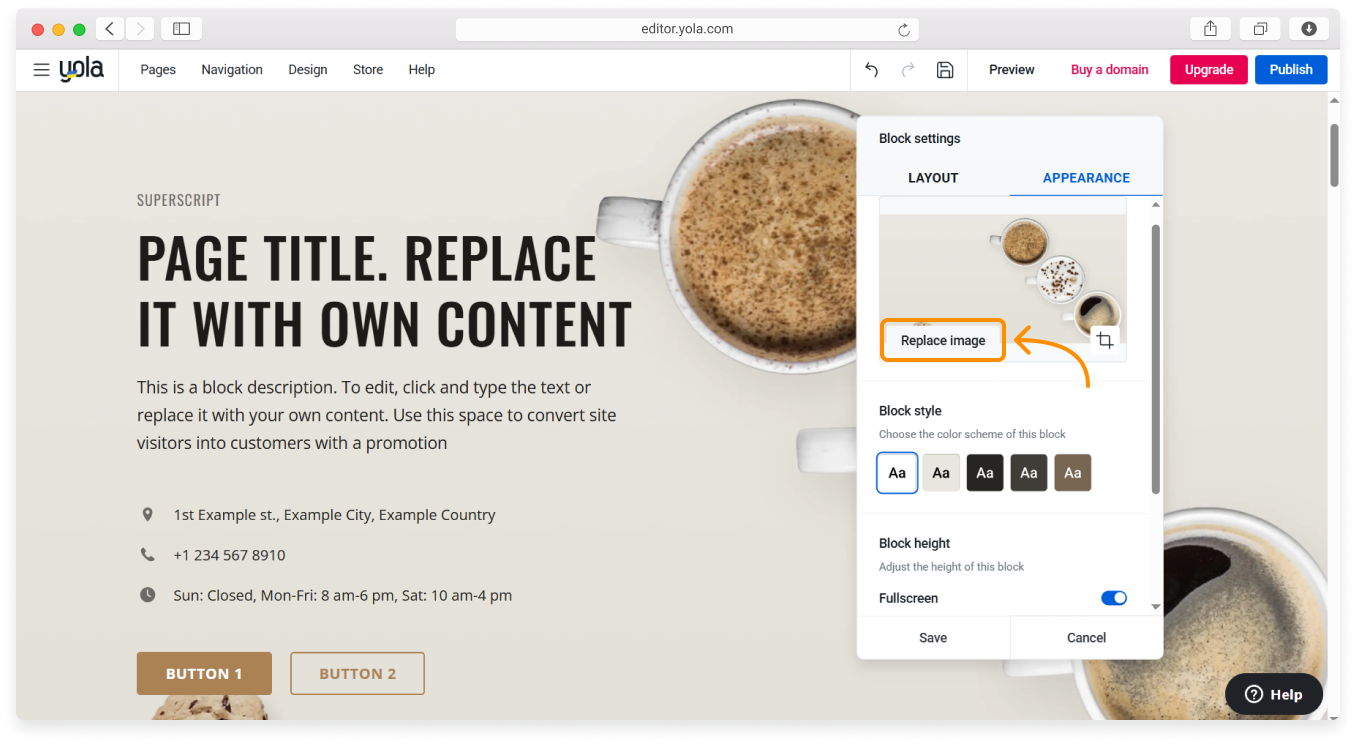 In the Appearance tab, you can choose the background color of your block, modify content alignment, turn the background overlay on, and many more. Since every block type has its own special features, each of them has its own selection of settings. Let’s review the settings options one by one.