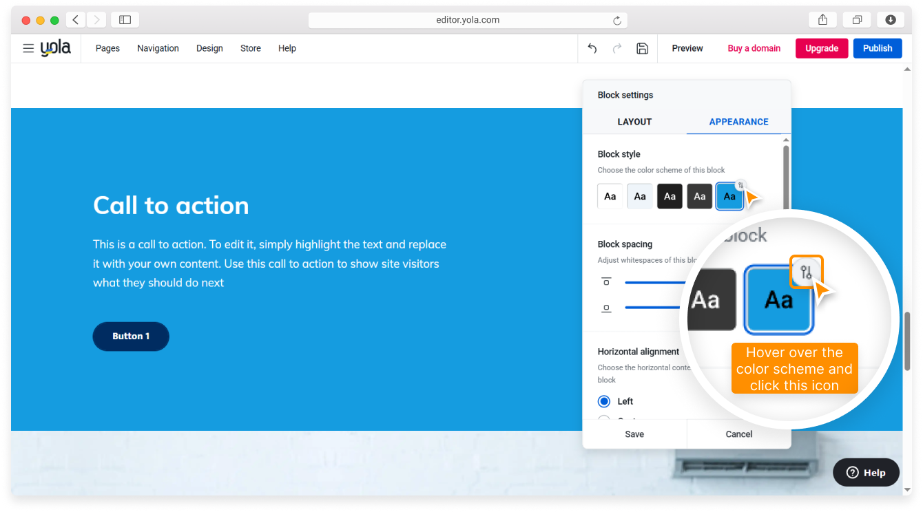 If you haven’t found a color you like for the block, you can change your site’s color palette directly from the Appearance tab by hovering over a color scheme in the Block style section and clicking the Customize icon.
